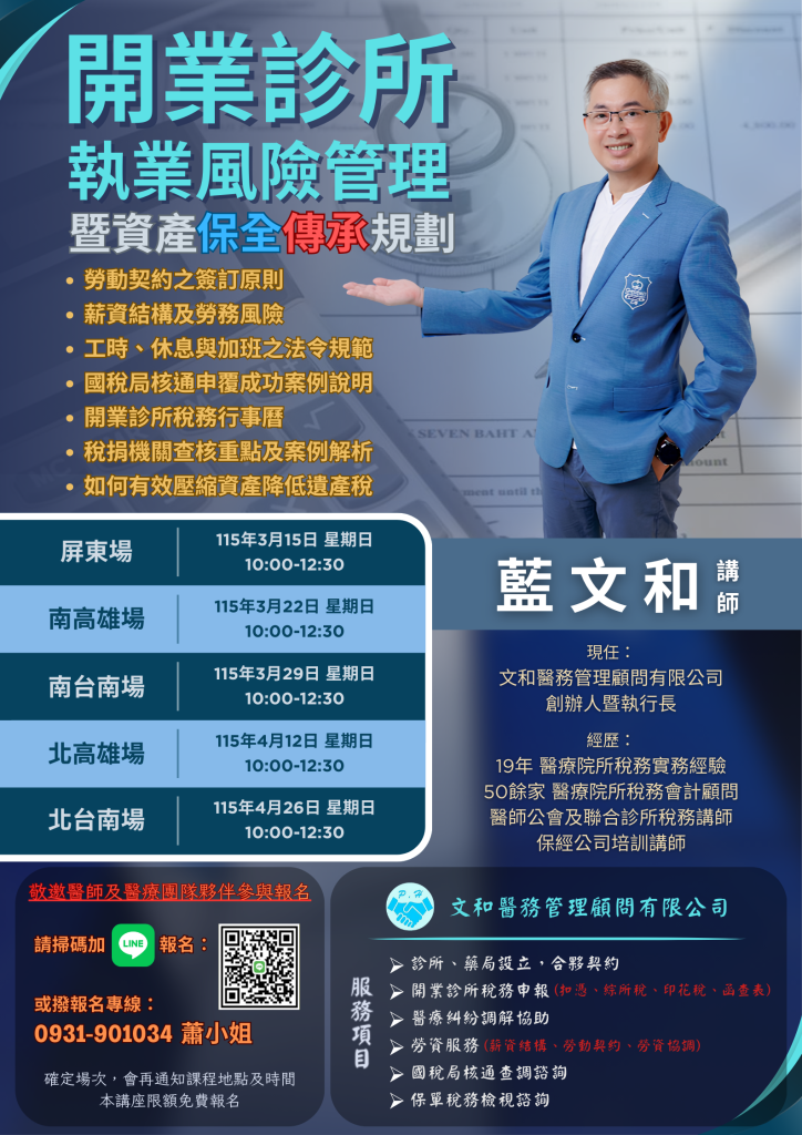 本場講座將從「診所實務經營」角度出發,結合多年醫療院所稅務輔導經驗,帶您一次掌握: